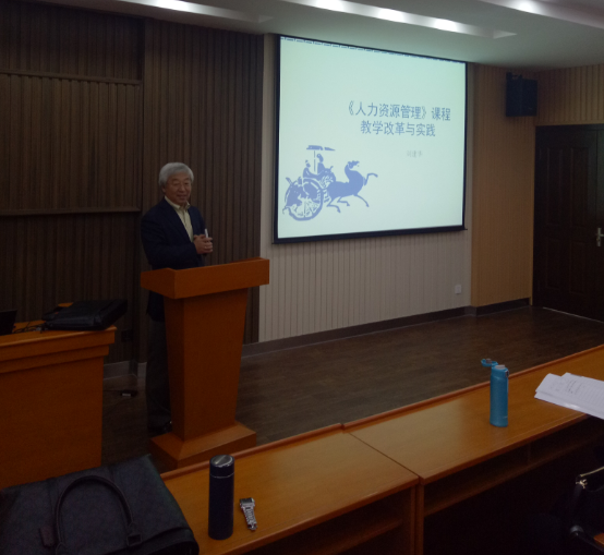 刘建华老师以“《人力资源管理》课程教学改革与实践”为题,首先通过问卷调查的方式就“学习人力资源管理课程的目的、学习方式、实验课、专题讲座”等对学生学习需求进行调研;其次,设计教学改革的总体框架并针对“教学目标、内容改革、手段优化”提出改革措施;最后从“传道”的高度,提出了“为学生服务,学生是上帝,把学生培养成为一个完整的人”的教学理念。